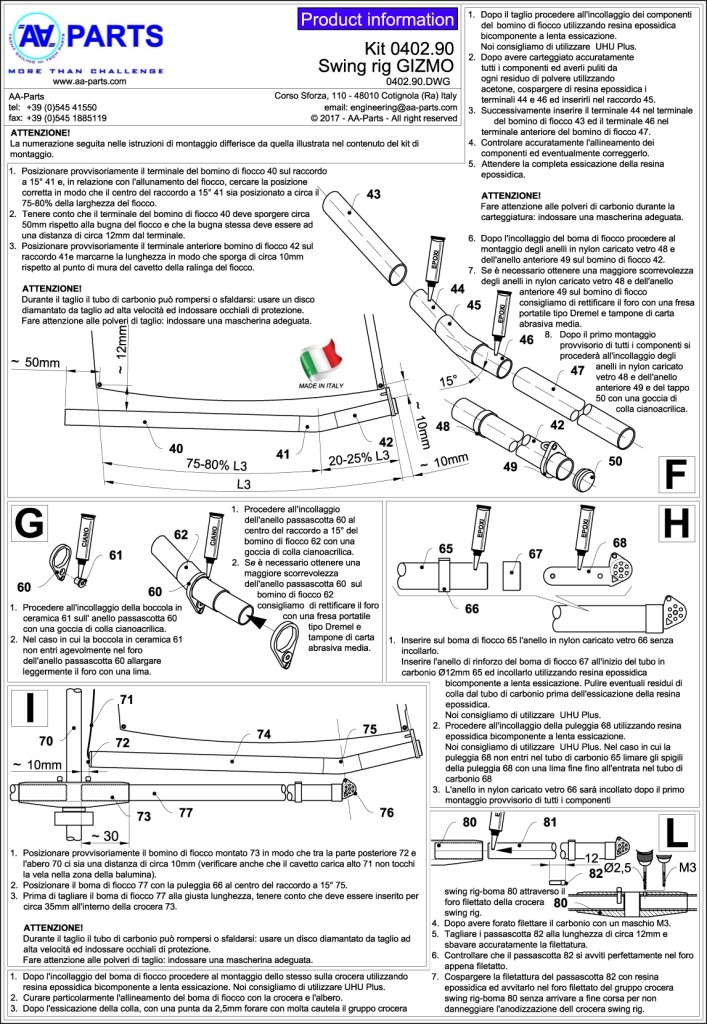 - Kit completo con boma balestrone montato: tutto il boma balestrone (crocera, boma di randa con raccordo a 15°, boma di fiocco con puleggia, bomino di fiocco con raccordo a 15°) è fornito preassemblato ed incollato. Restano da eseguire: l'assemblaggio delle scotte di movimentazione del Gizmo, il montaggio di alcuni anelli, l'assemblaggio delle scotte di movimentazione della randa e del fiocco. Il kit non comprende l'albero e relativi accessori.